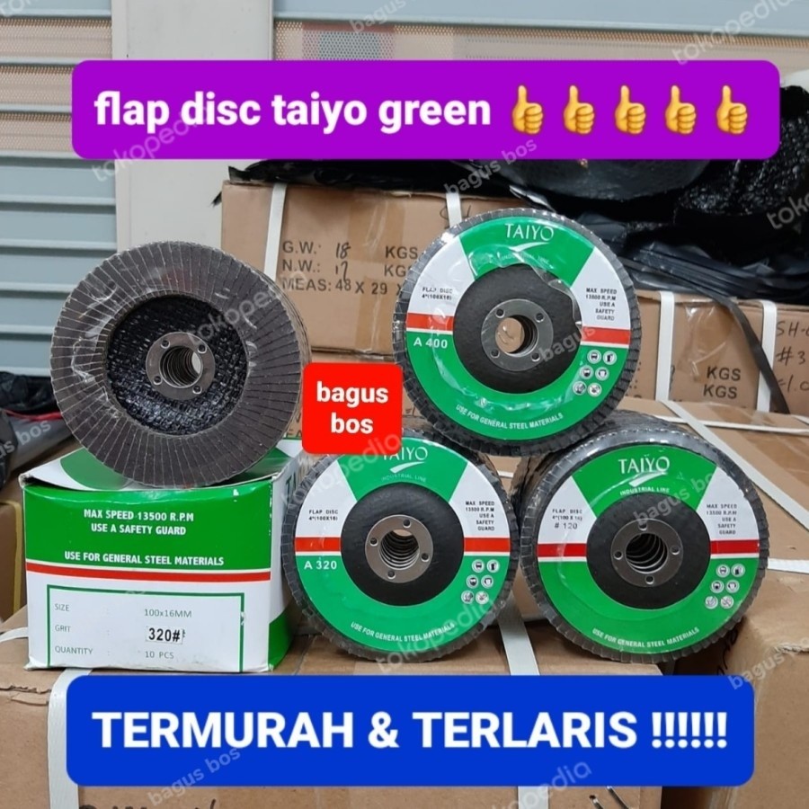 Taiyo Flap Disc green Industrial Line merupakan amplas yang digunakan pada unit gerinda untuk pengaplikasian pada bidang datar dengan hasil lebih halus.