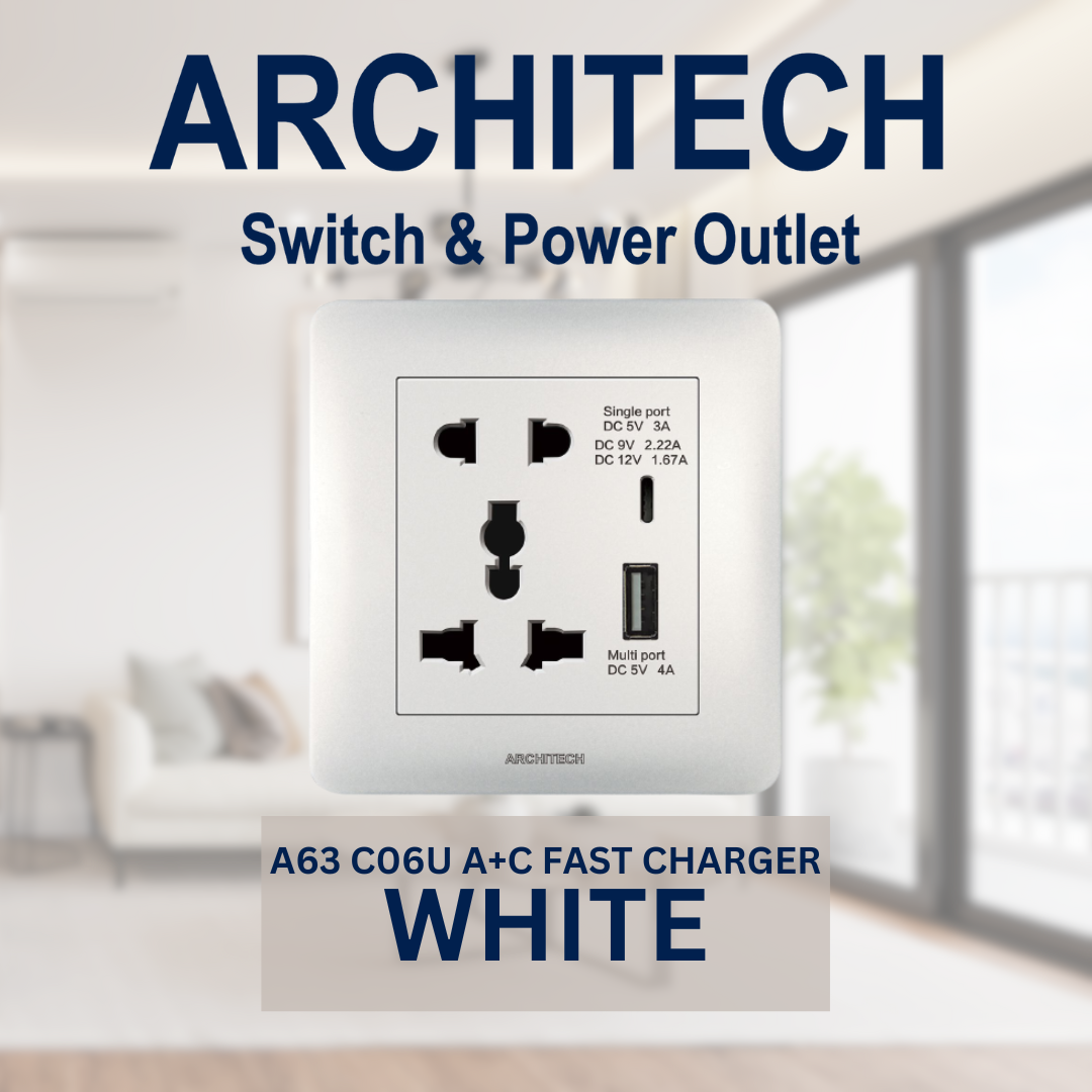 ARCHITECH A63-C06U A+C FAST CHARGER INFINITY WHITE Stop Kontak – Colokan Listrik – Universal 2 Pin 3 Pin Dengan 4A USB 2 Port Black Titanium
