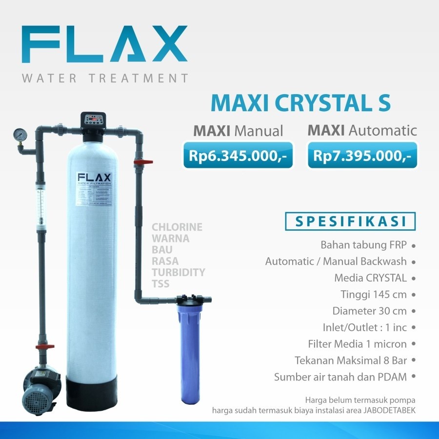 FLAX CRYSTAL S sangat efektif untuk mengatasi bau, warna, rasa dan chlorine. Disempurnakan dengan penyaringan sampai 1 micron. Air akan terfiltrasi sampai partikel yang tidak kelihatan kasat mata sehingga air yang dihasilkan akan jernih sempurna. Menetralkan dan menjernihkan air secara maksimal untuk anda dan keluarga.