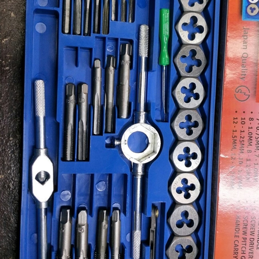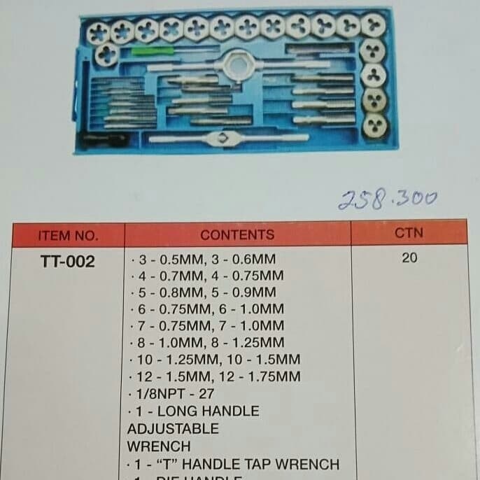 3-0.5mm, 3-0.6mm, 4-0.7mm, 4-0.75mm, 5-0.8mm, 5-0.9mm, 6-0.75mm, 6-1.0mm, 7-0.75mm, 7-1.0mm, 8-1.0mm, 8-1.25mm, 10-1.25mm, 10-1.5mm, 12-1.5mm, 12-1.75mm, 1/8npt-27, long handle adjustable wrench, T handle tap wrench, die handle, screwdriver, screw pitch gauge, handle carrying case