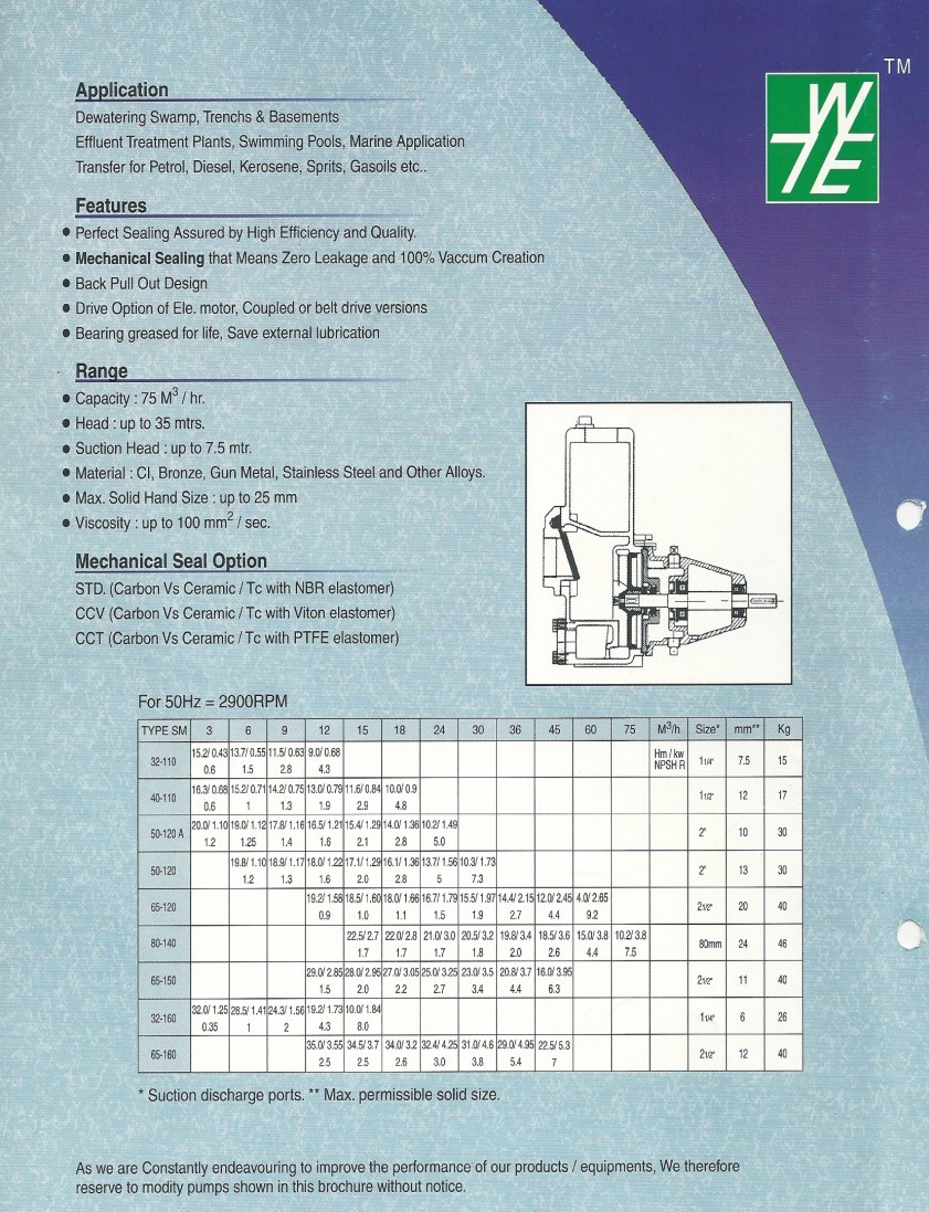 Aplikasi Self priming Non Clog Pump SM : Transfer solar, bensin, kerosene, minyak tanah, Air kotor, Air tawar, Pengeringan rawa, parit & saluran, Pertambangan, Pabrik minyak sawit & kilang minyak, Pengolahan air limbah di WWTP & ETP, Kolam bernang, Transfer air laut & bilge di perkapalan dan lain-lain.