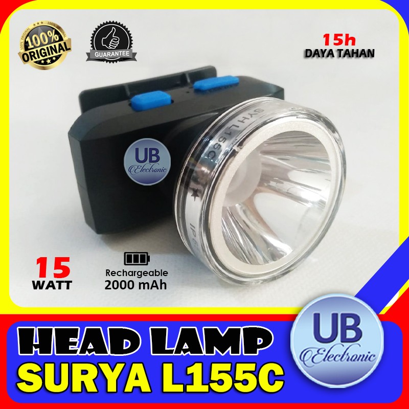 Senter Kepala LED 15W SURYA SYH L155C dengan lampu cahaya putih yang terang dan dapat dibawa kemana saja.